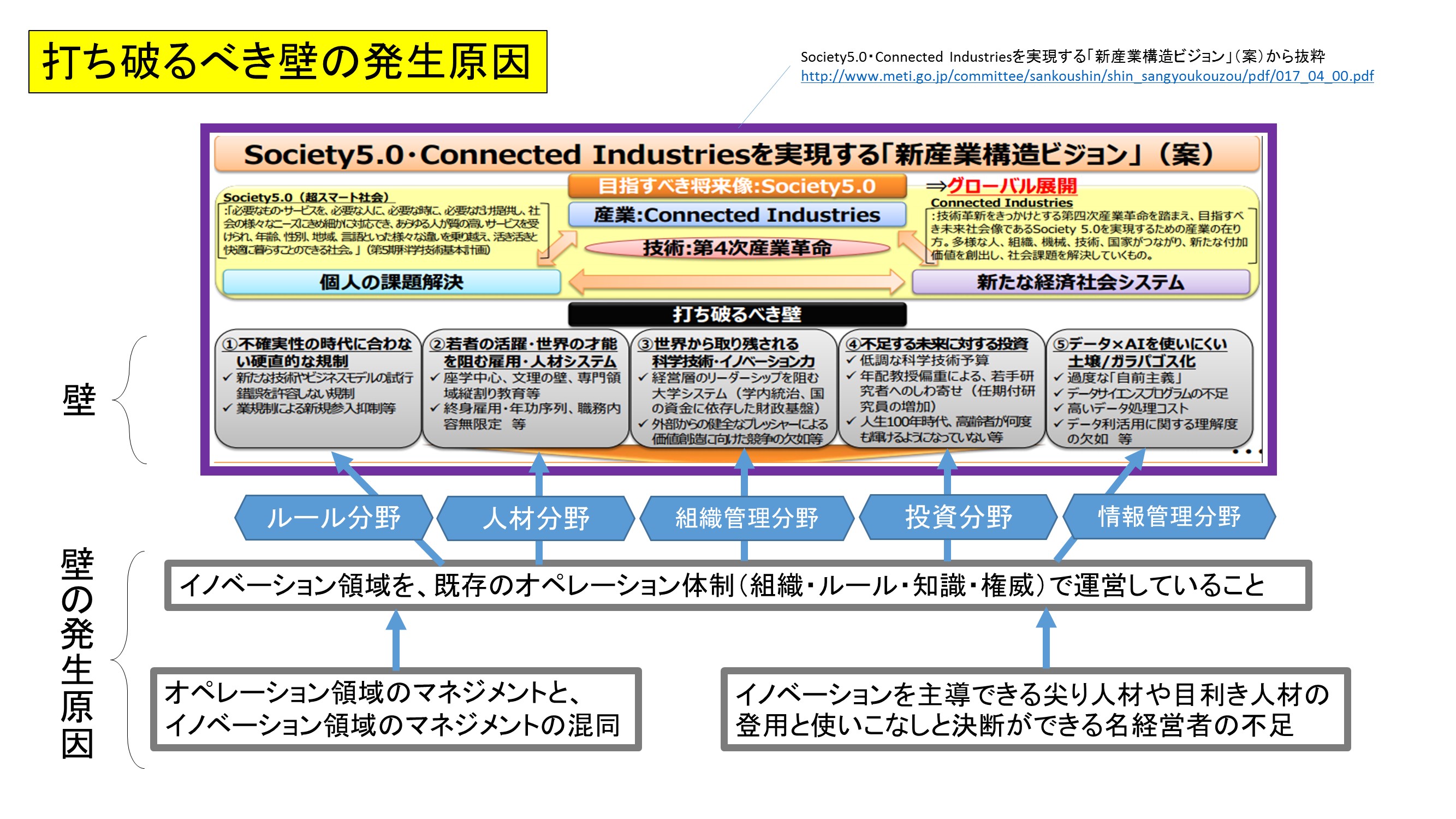 新産業構造ビジョン(案)が指摘した5つの壁の発生原因についての私の考えを下図に示す。